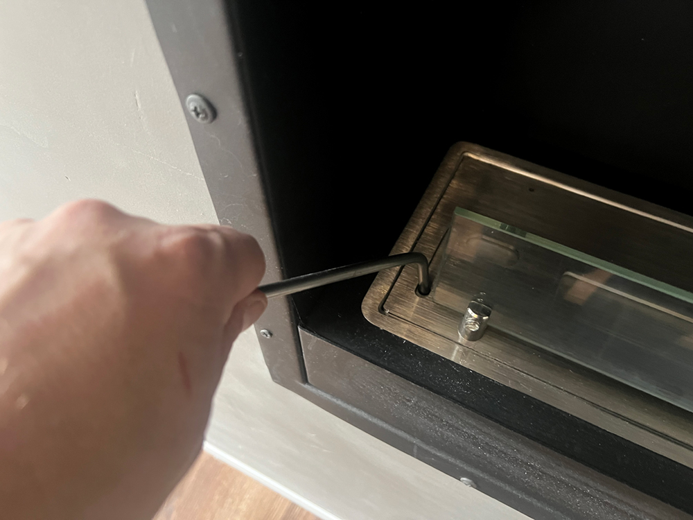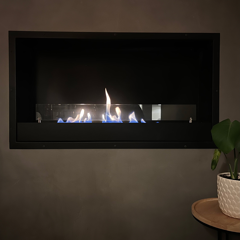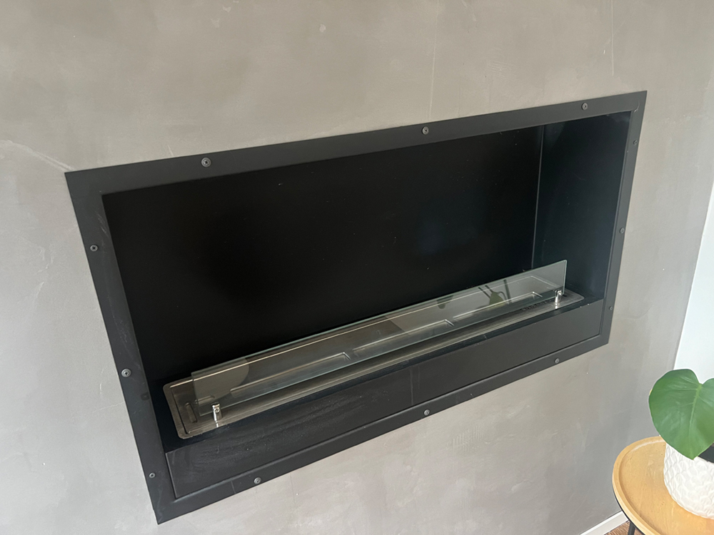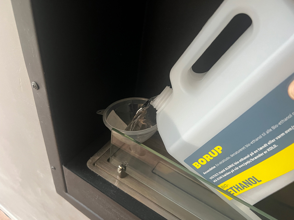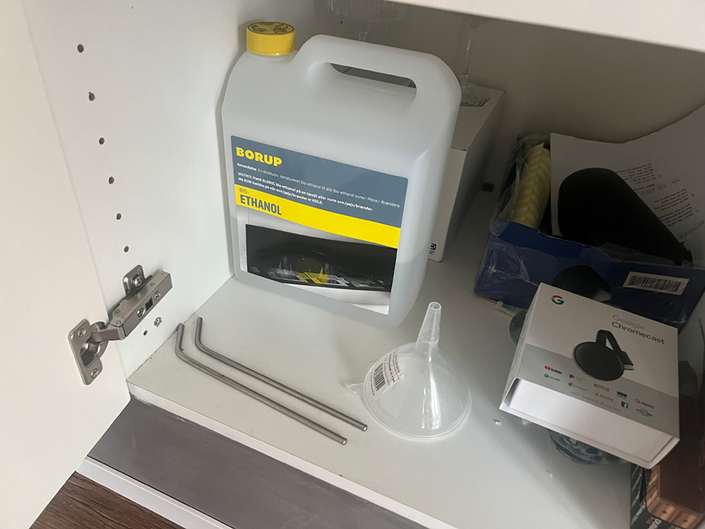 Bio-ethanol og udstyr er i skabet ved siden af biopejsen. |