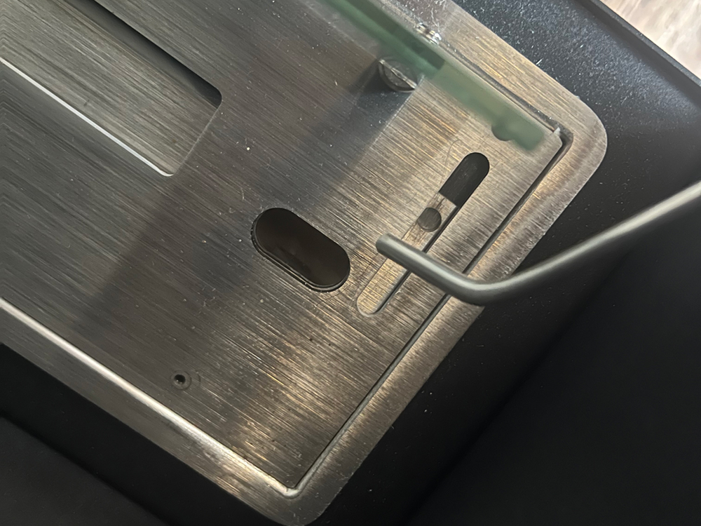 Håndtagene passer ned i to huller i metalpladen. |
