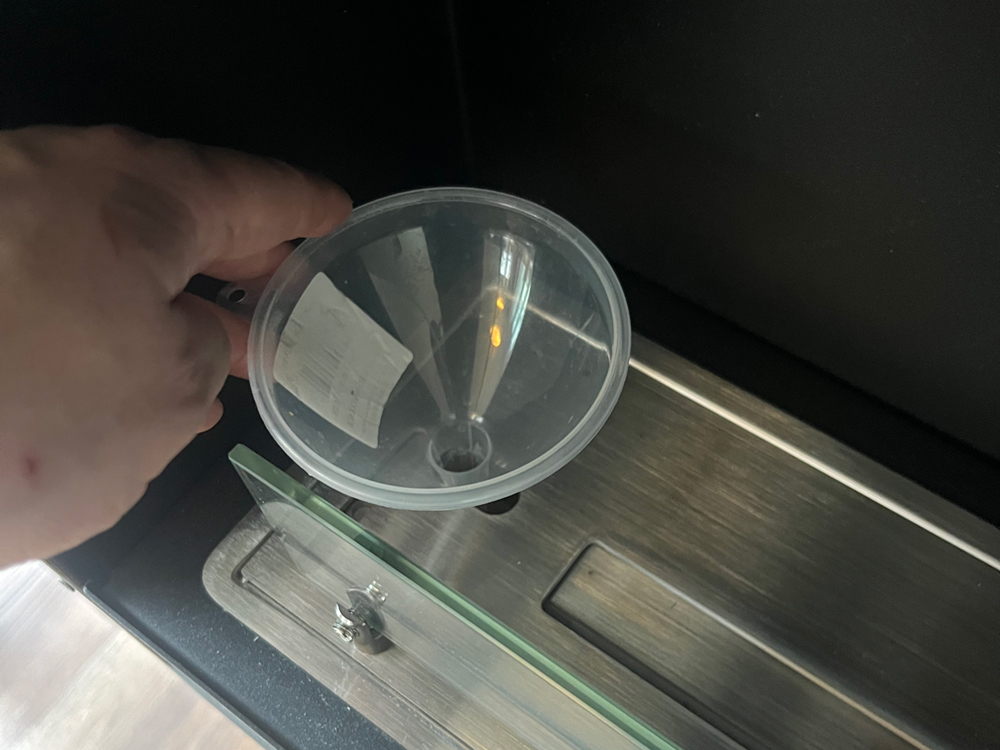 Brug håndtagene i hver ende af biopejsen til at skubbe pladen bagud, til der kommer plads til tragten. |